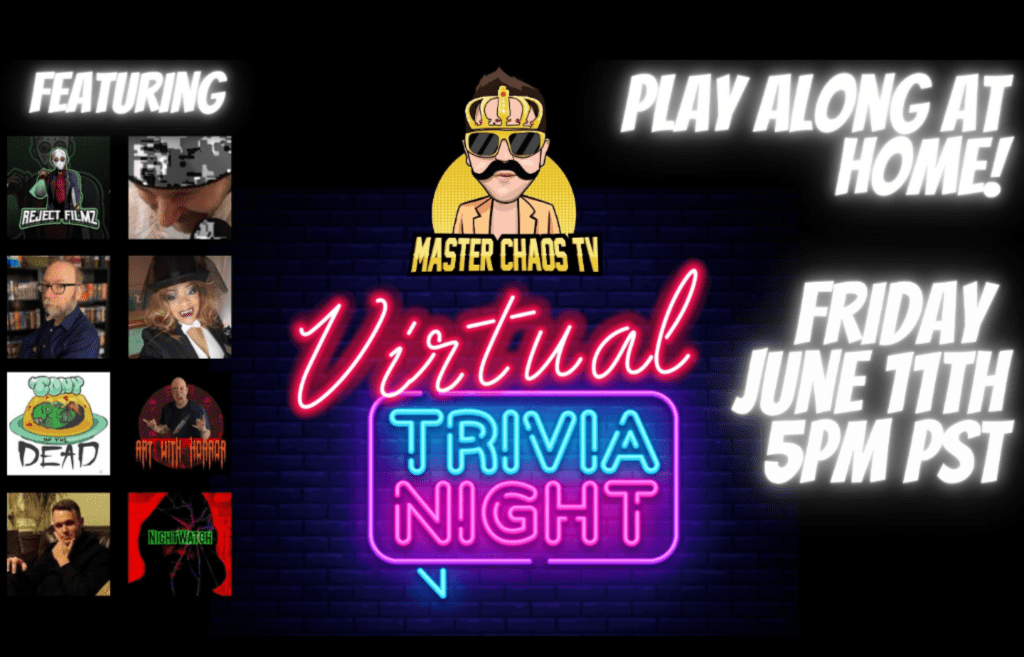 Virtual Trivia Night! What Did I Just Watch? / June 11, 2021 Hey Latchkey Kids and Drive-In Mutants join us for a virtual trivia night on Master Chaos TV! Friday June 11th, 2021 5pm PST/8pm EST Share this: Click to share on X (Opens in new window) X Click to share on Facebook (Opens in new window) Facebook Click to share on Reddit (Opens in new window) Reddit More Click to email a link to a friend (Opens in new window) Email Click to share on LinkedIn (Opens in new window) LinkedIn Click to share on Pinterest (Opens in new window) Pinterest Click to share on Tumblr (Opens in new window) Tumblr Click to share on Pocket (Opens in new window) Pocket Like Loading...
